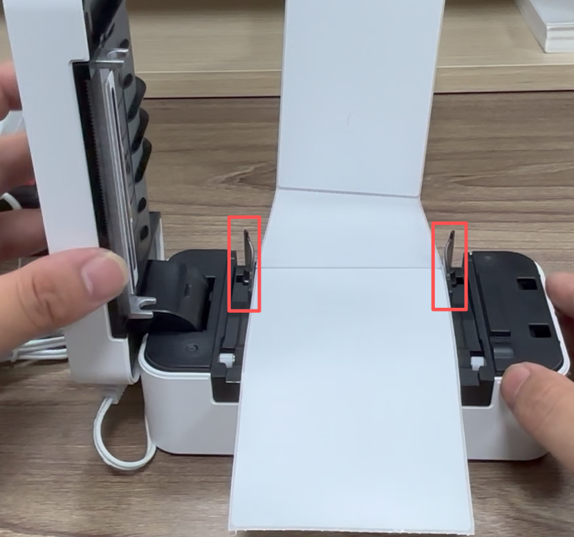 3.Load the labels and adjust the media guides to fit the label width. Ensure the printable side is facing up.